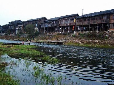 章渡老街,一边临河而建木铺,一边座北朝南明清建筑鳞次栉比,街面三米余宽,临河的木屋建筑据传是明中期,一共有108栋,由1080根木柱立于央央大水中支撑着木屋,数百年来,任凭风雨涤荡,哪怕河水暴涨街面,它昂首屹立岿然不倒,这也是它多少年来吸引四方游客的好奇所在。连日本的建筑家都慕名而来。历史上有关它的传说很多,有说是明朝的张天师路过此地指天划地获此风水宝地,也有说是刘伯温深谙天文地理从中点化。据我三十多年的观察,实际上是上游左端支流中村乡河道的坚挺,缓冲了章渡沿河水流,确保了“吊栋阁”木屋百年安然无恙。