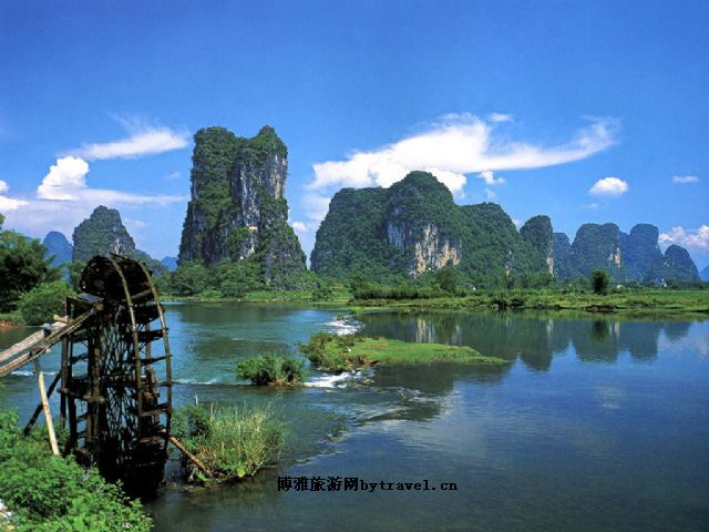 阳朔 “桂林山水甲天下, 阳朔堪称甲桂林, 群峰倒影山浮水, 无水无山不入神”高度概括了阳朔自然风光在世界上所占有的重要位置。阳朔地处中亚热带季风区, 气候温和, 四季宜人。属典型的客斯特岩溶地貌, 境内山峰林立, 平地拨起, 千姿百态, 如人物、似走兽、若器皿、类飞禽, 别具情趣, 令人玩味无穷, 山上竹木繁茂, 四季常春, 山山有洞, 洞洞奇美, 洞中乳石遍布, 晶莹剔透, 如艺术长廊, 似天然迷宫, 阳朔的水清撤透明, 绿水悠悠, 如情似梦, 唐代著名文学家韩愈形容为“江作青罗带, 山如碧玉簪”, 以其“山青、水秀、峰奇、洞美”四绝而闻名, 是美丽的桂林山水之精华所在地。