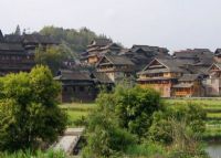 岩寨——三面环山,东南面为林溪河,地势北高南低。来自西南面的小溪从山间穿过,在寨北折转向东南,穿寨而过江入林溪河。这条小溪将寨子分东西两区,溪东两水之间的三角地带为寨子的东区,是岩寨原先寨子的范围,其东西两侧以溪河为湟濠,北面靠山处原有防卫的寨墙,现只有两座寨门尚存。东区在林溪河边建有老鼓楼,鼓楼建在硬石块垒砌的陡坎上,为三间悬山顶两端带披檐的殿堂式,中间加重檐歇山顶形成三檐模样,从鼓楼沿河南下,不远处的河边码头旁有青石砌成的“萨坛”,坛外还有数棵古老的风水树。寨子背面的山峰名为“衙萨”,即萨坛峰之意,被认为是村寨的“风水山”。寨内5条石板古道,组成村寨的交通主干道,街巷小径狭窄,或用石板铺成,或用卵石砌就,通往各家各户。寨子的外部溪流和内部小溪、水塘和水井构成了完善的供水系统,其中4口建有井亭的古井是村民饮水的水源。寨子里建有2006年的新鼓楼和非物质文化传承展示中心。