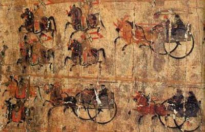 中室四壁绘的室墓主人“出行图”,上下共四层,每层均有大量车、骑及伍佰(武官)、辟车(文官)之类的导从,和一辆主车。最下一层主车的乘者室墓主人,后面室墓主人的妻子。