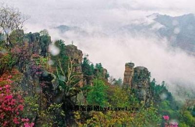 情染杜鹃景区位于仙翁山景区中部,是东走向约200米长的山峰。从东至西有“忘乡猴”、“杜鹃峰”、“虎跳峰”、“情侣峰”五个景观。景区最高点海拔390米。站在杜鹃峰向北遥望对面仙翁峰、野狼峪、忘忧崖,向南可见石宫圣境的最高点“仙佛临顶”和幽谷天音的最高点“玉掌峰”。
