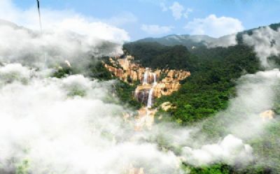 在江北的名山大川中,像蒙山的水帘洞瀑布这样的三叠瀑布是不多见的。它在青山层岩间奔腾跳跃,闪转腾挪,从约百米高的悬崖上一跃而下,中间为断崖阻隔,旋即又腾身直泻,形成了飞流奔涌、轰鸣溅跳的叠式瀑布。水跌下霰雨纷飞,彩虹时现,美丽非凡,清洌的水气使人身心顿爽。明朝的公鼐曾作《蒙山瀑布》对之赞美:“岂是银河落,飞来万丈余。谪仙如可见,不复问匡庐。”清朝的王运晟这样来描写水帘洞瀑布:“蹑蹬觅仙境,流从天半垂。出云偏有隙,停雨境无期。水击石鼓鸣,风披练破丝。至今帘不卷,终古月空窥。”意思是说:沿着石阶小路去寻觅仙境,一条瀑布从半天垂落,水帘象飘动的白云,又象大雨飘落,永不停歇。水流冲击着岩石,发出打鼓一样的声音,风吹瀑布象飘散的丝线,水帘长垂不卷,千百年来,月光徒然照临,伺机穿过水帘,却被永远隔绝。