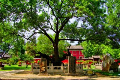 树下有明万历年间甘一骥书“唐槐”大字碑,又有清康熙年间张鹏翮题《唐槐诗》碑。西树立有清乾隆帝亲笔题刻:“兔目当年李氏槐,枒槎老干倚春阶、何当绿叶生齐日、高枕羲皇梦亦佳。”院内遍植槐树,春夏之际,满院飘香。百碑墙、古槐荫山、槐香池,再加上点缀其间的盆景,别有一番情境。