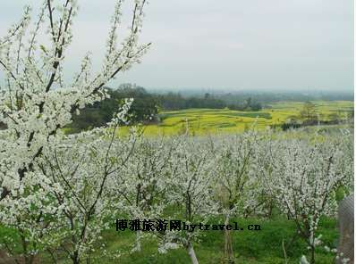 无根山景区拥有数千亩原始森林、万亩果园和川西宝镜白塔湖,森林覆盖率达到90%以上,空气质量优于I级,是成都平原的天然氧吧。现有各类果林3万余亩,其中以花果山为核心的省果繁站和园艺场区域内就有1万余亩,主要种类有布朗李、梨子、桃子、柑橘、苹果、葡萄、枇杷等。站在果繁站山顶和公议乡梓潼村山顶,放眼望去煞是壮观。春时,梅花、杏花、樱桃花、李花、梨花、桃花、樱花、柑橘花竞相开放,一片姹紫嫣红、百花争艳的景象,驱车至坐落于半山腰中的农家乐山庄,登高望远,美景尽收眼底,令人心旷神怡;夏秋时节,各种水果逐渐成熟,到处果味飘香。身临此景,休闲度假、释放热情、朝看薄雾笼青翠、暮停归鸟声啾啾,可尽享涤净身心,进入天人合一之境界。