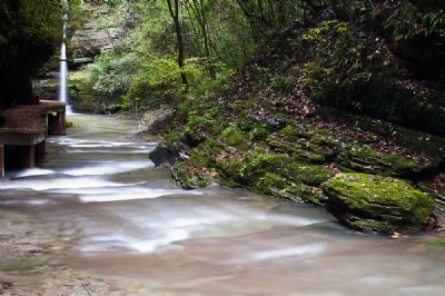 端公潭瀑布,高60m,潭深约8米,这里四面环山,上面又是古藤绿树,这个潭水是墨绿色的。瀑布从山崖藤蔓缠绕中冲下,直落深潭。一条瀑布有两样风格,一半阳刚,另一半婉约。阳刚的如涉世未深、直闯无碍的少年,阴柔婉约的则如以秀发拂面的羞答答山姑。潭中水深,清,寒,底部为布满绿苔的石头,被冲得如锅底一般。清风不来时,水波不兴,瀑声柔柔,如山女的月下浅唱;清风骤起时,风云开阖,涛澜汹涌,则如莽汉唱大江东去。