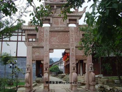 葭萌坊,整个牌坊雕刻技术精湛,图饰古朴典雅。在春秋时期,今昭化嘉陵江流域一带生活着的居民,人们称他为苴人,其实苴人是巴人的一支,他们主要靠捕鱼打猎为生。至蜀王九世开明尚时,蜀国征服巴国苴人集聚区后,蜀王封地给他的弟弟于苍溪县北至汉中以南之地为苴侯国,号苴侯,并将都邑建在嘉陵江与白龙江交汇的土基坝上(当时叫吐费城)命名为葭萌。在《华阳国志蜀志》记:“蜀王别封弟葭萌于汉中,号苴侯,命其邑曰葭萌焉”。葭萌坊上雕有一幅柱联“蜀道三国重镇”,“天下第一太极”。昭化是一座古代文化的传承之城,尤以三国文化著称于世。从刘备入主葭萌(公元211年)到蜀汉灭亡(公元263年)短短的52年历史,将昭化推向了历史的最前沿,使昭化三国文化成为众多历史文化中最耀眼的一环。史载了刘备、诸葛亮、张飞、黄忠、霍峻、费祎、庞统等众多三国英雄人物曾在昭化运筹帷幄、厉兵秣马、跃马扬戈,留下了大量的三国蜀汉遗迹:葭萌古关、费祎墓、费敬侯祠、战胜坝、桔柏古渡、天雄关、牛头山、姜维井等等,所以被誉为“蜀道三国重镇”。绕城而过的嘉陵江被前方的笔架山和后方的翼山分割后形成了一道呈反“S型”、酷似道教的阴阳太极图。面积为20平方公里,直径5公里,昭化古城正好位于太极图阳极的鱼眼之上,故而称之谓 “太极天成”。据目前所掌握的资料,如此气势宏大的山水太极图在国内尚属罕见,因而被誉为“天下第一山水太极”。