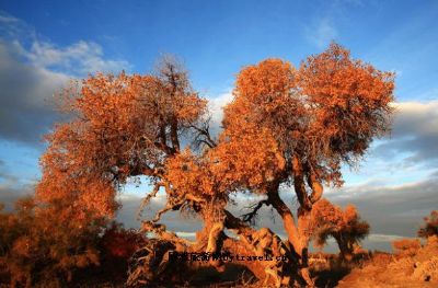 位于准噶尔盆地,古尔班通古特沙漠东南缘的木垒原始胡杨林距木垒县城约150公里,距鸣沙山35公里。据有关部门鉴定测算,这片原始胡杨林面积约30平方公里,止少存活6500万年,属地质四代的遗物,是研究地球早期活动的活化石。可以想象,6500万年以前这里是一辐怎样的景色,茂密的胡杨林,成群的脊椎爬行动物,它们毫不畏惧地把这里当作一片繁衍生息的乐土。后来由于地质表面的剧烈活动,导致大气变化,原来绿翻翠浪,湖水荡漾,风景秀丽的动植物园逐渐变成了黄沙蔽日,恶风嗥叫的不毛之地,唯有这片英雄树不畏-,奋力抗争,躲过了无数次的灾难而劫后余生。清一色的胡杨,远远望去恰似哈萨克人的形容,像一顶顶欲盖苍穹的绿色毡房;铁干峥嵘,虬枝相绕,或直立或偃蹇,或瘦骨伶仃或丰肌胖体,遮天蔽日,好不气派!那层层叠叠的桃形绿叶,就像页页书画描述了胡杨的古今历程,“蓦看银杏势参天,阅尽沧桑不计年”,俨然一派古荒风度。它饱尝了千百年的风剥雨蚀,处在极度严酷的自然环境中却不失傲视苍穹的本色,依然是万古至今生机盎然,难怪哈萨克把它称之为“房子似的胡杨林”,沙漠中的英雄树!