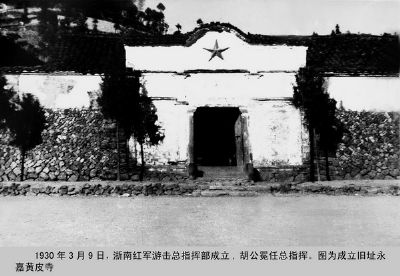 浙南红军游击总指挥部成立旧址为红色旅游经典景区。 永嘉县溪下乡黄皮村地处永嘉、仙居两县边境,原属仙居县金竹乡黄皮村,1948年划归永嘉县溪下乡管辖,是温(州)、台(州)、金(华)3个地区接壤的三角地带,易守难攻,且具备群众基础,是理想的红军后方基地。1929年11月19日,中共永嘉中心县委领导-农民在此成立浙南革命委员会与浙南红军游击队,该村一批贫苦农民踊跃入伍。翌年2月3日,浙南红军游击队在该村革命群众的支持下,打败了仙居十八地反动民团。3月初,中共中央军委派胡公冕到浙南领导武装斗争。3月9日,红军游击队在该村广福禅寺中大殿召开大会,400多名红军战士参加会议。大会宣布浙南红军游击总指挥部成立,由胡公冕任总指挥,刘蜚雄任参谋长,王国祯、李振声负责政治工作,金国祥负责经济工作。随后,红军游击队整编为3个支队、1个直属队,雷高升、胡协和、谢文侯分别任支队长,胡衍真任直属队队长,下设41个分队,计400余人枪。浙南红军游击总指挥部成立,为中国工农红军第十三军的建立奠定了基础。